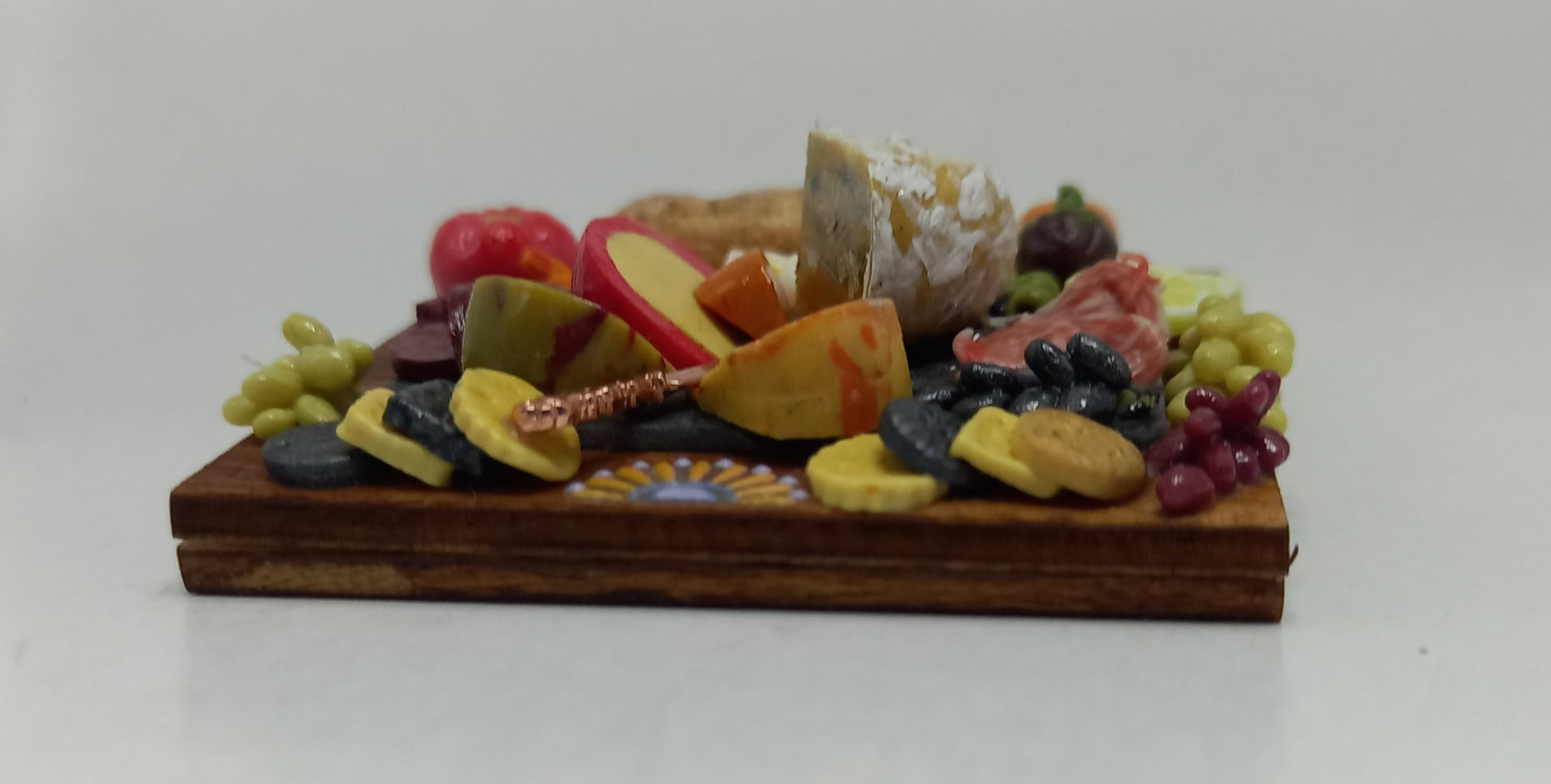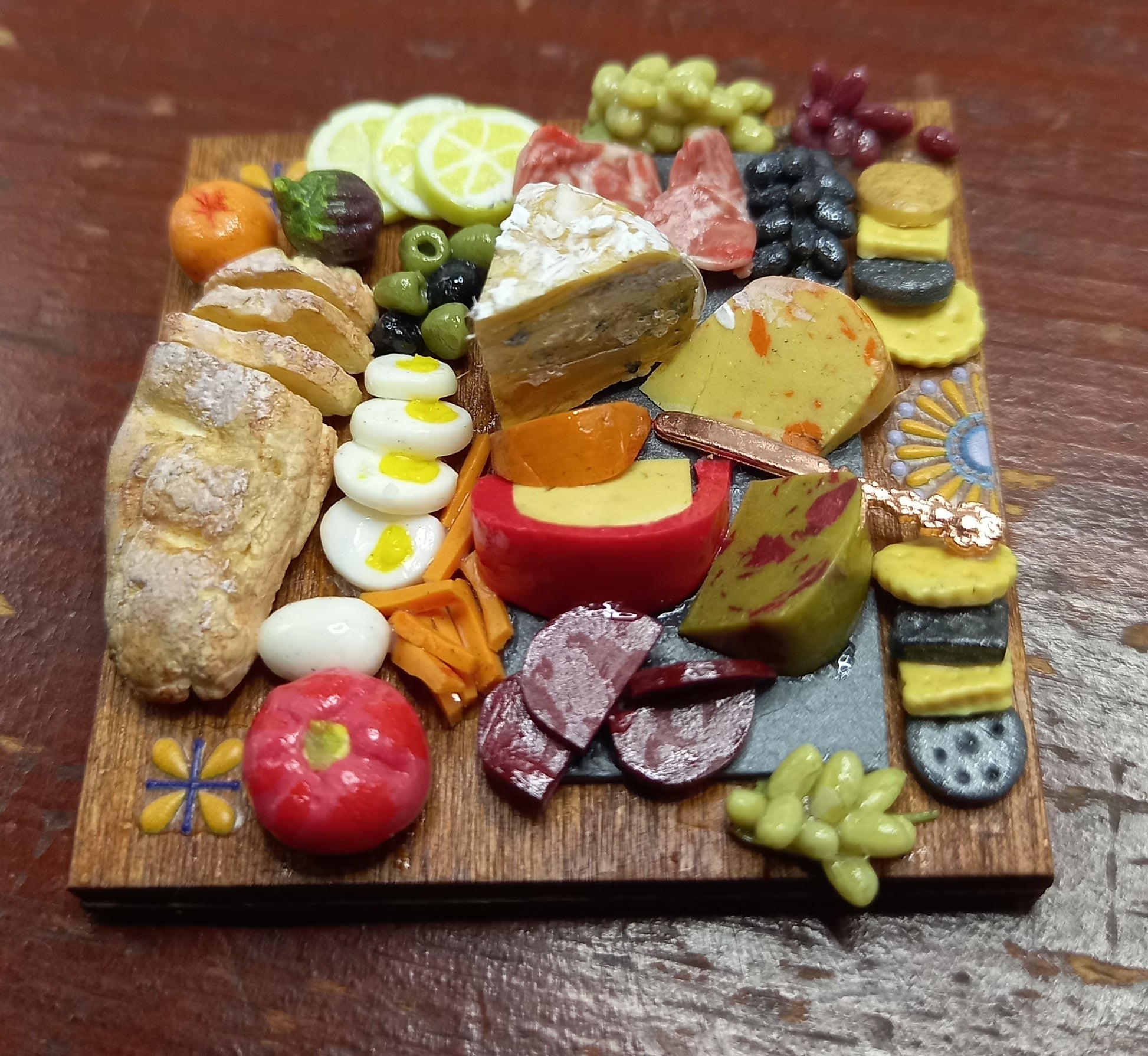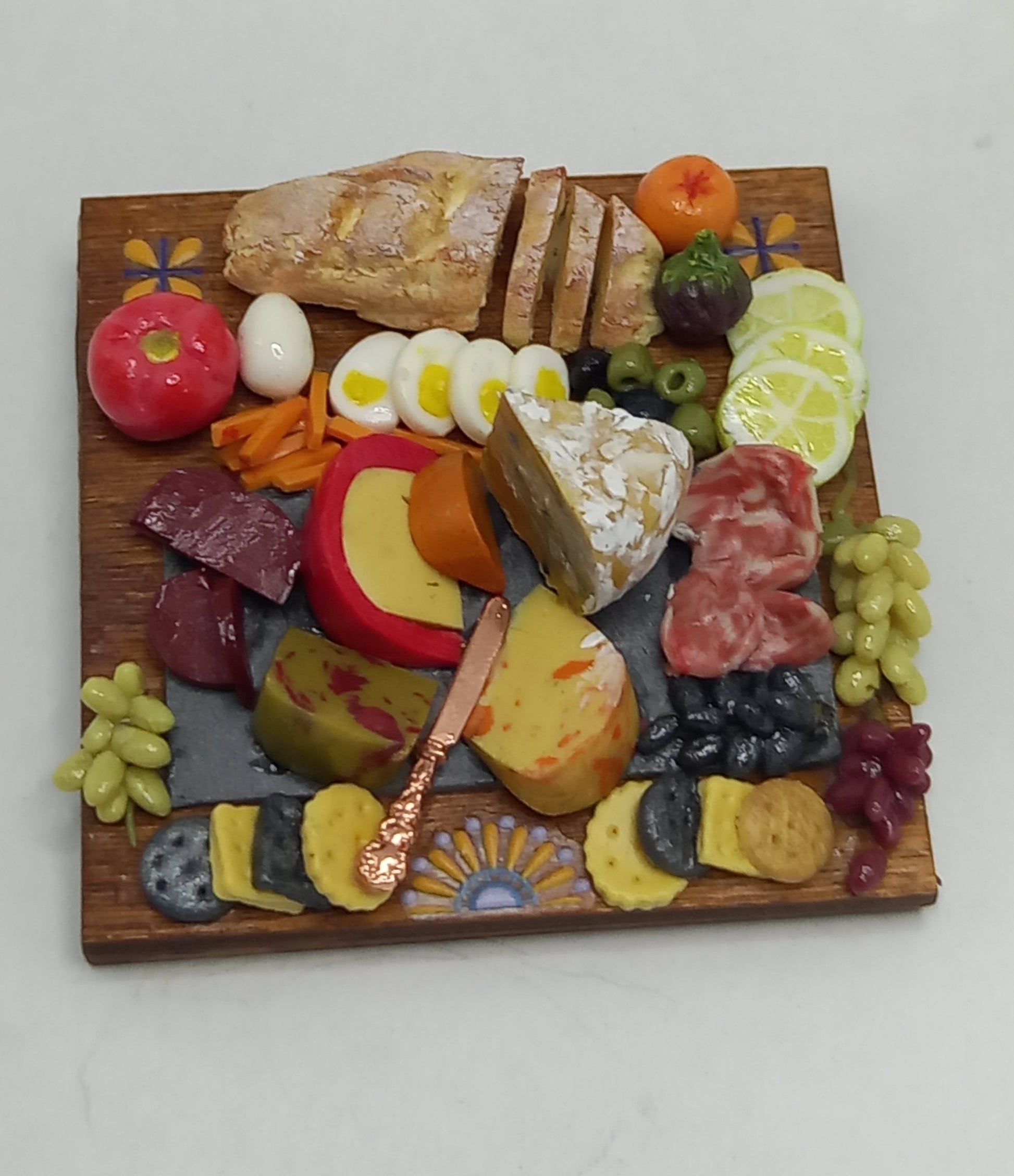 1:12 Scale Charcuterie selection on a wooden board, cheese ,meats, eggs, bread & crackers